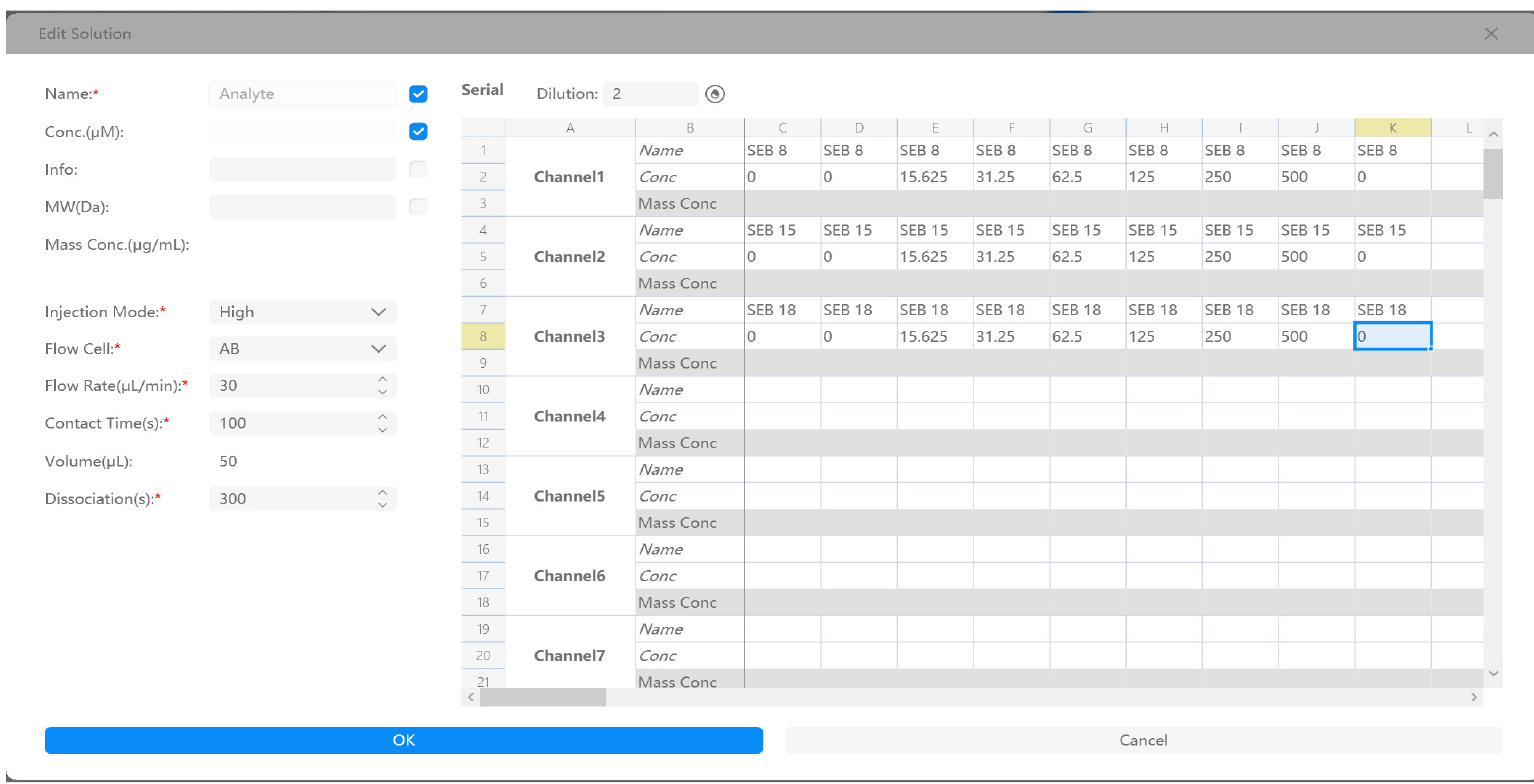 勾选Name 右侧方框(不同通道运行不同样品),在右侧表格依次填写样品名称。勾选Conc.右侧方框(不同cycle运行不同浓度),稀释比例Dilution填2,右侧表格内填写样品最高摩尔浓度后,向左拖动选择计算区域,单击 ,系统将自动计算和填写完整浓度梯度15.6–500 nM。可在样品浓度梯度前设置1–3个0浓度,作为Blank(图4)。