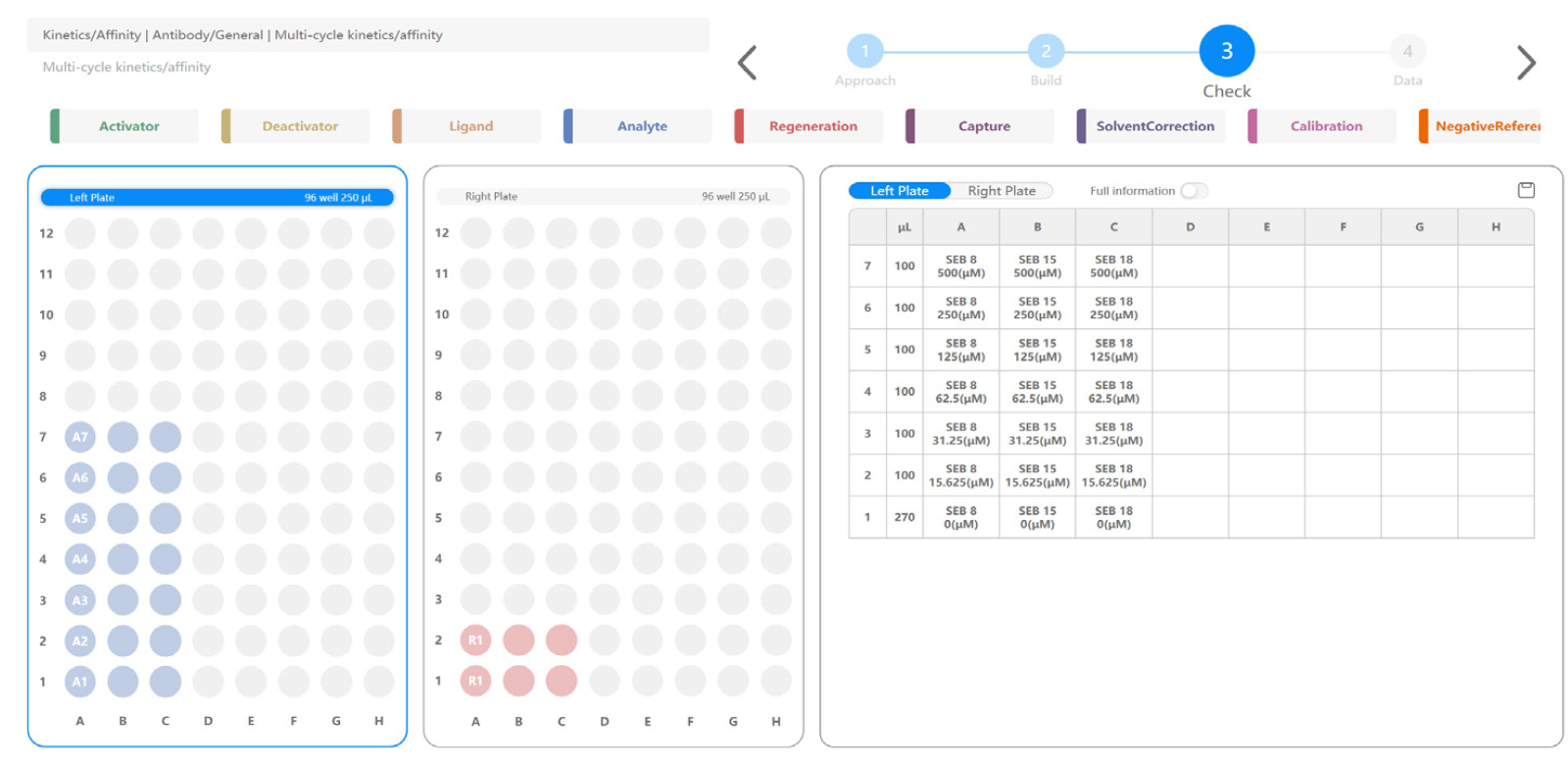 软件自动将样品排布在微孔板内(可通过鼠标右键拖拽重新安排)。按照屏幕显示,不同的纳米抗体样品用运行缓冲液HBS-T进行倍比稀释,准备足够体积的样品(如下图,左侧孔板raw1每孔溶液至少应为270 μL)。(图5)