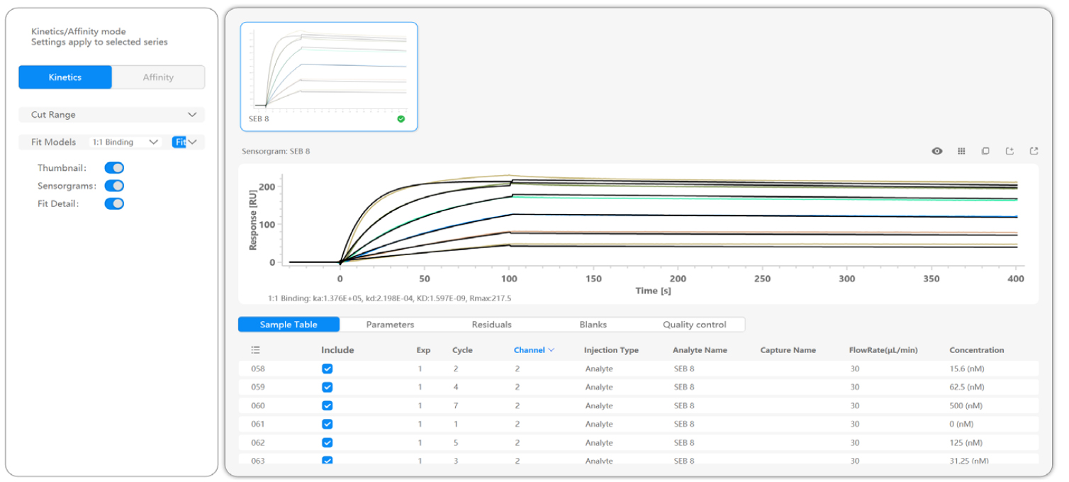 - 软件界面默认显示已经扣减过0浓度的sensorgram,可在这个界面完成数据的基本检查。在Thumbnail区域可选择待分析的样品数据,如果哪个浓度的样品检测结果不合适,可以在下方Sample Table中取消此浓度前的