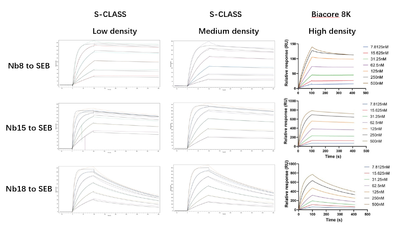 对比两台SPR仪器检测得到的Nb/SEB互作传感图(图8),可看到结合解离趋势基本一致,且同浓度Nb结合信号的高低与SEB的固定密度呈直接正相关。这证明了SEB有效活性比例在实验中相对固定且检测方法重复性良好。